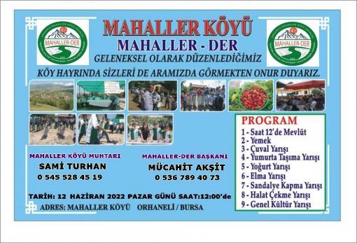KÖY HAYRIMIZA DAVET ![]() ![]() ![]() 12/06/2022 TARİHİNDE ORHANELİ MAHALLER (mah) KÖYÜNDE MUHTARLIK - DERNEK YÖNETİMİ ÜYELERİMİZ KÖYLÜLERİMİZİN VE HEMŞEHRİLERİMİZİN KATILIMIYLA HER YIL GELENEKSEL OLARAK DÜZENLEDİĞİMİZ KÖY HAYRIMIZA TÜM HERKES DAVETLİDİR....ALLAHIM DUALARIMIZI VE HAYIRLARIMIZI KABUL ETSİN İNŞALLAH MAHALLER-DER DERNEK BAŞKANI MÜCAHİT AKŞİT |